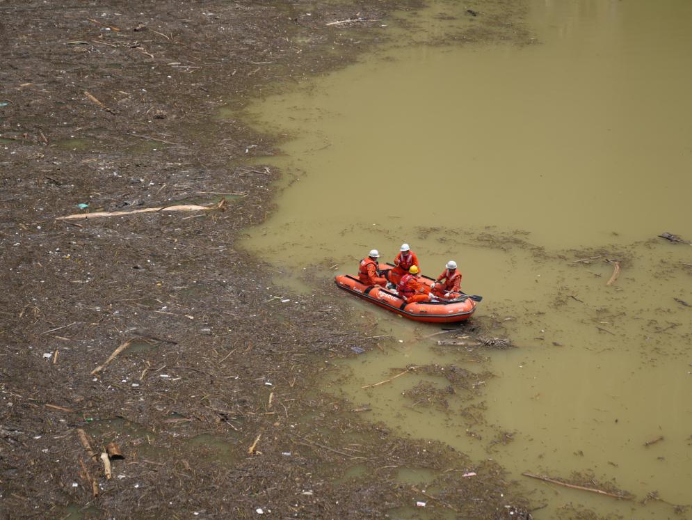 据现场救援人员介绍,因发现部分落水车辆残骸,这一区域是当前搜救工作的重点之一。由于堆积物过多,他们在这里使用了无人机、声呐、水下机器人等设备,开展拉网式立体搜救。