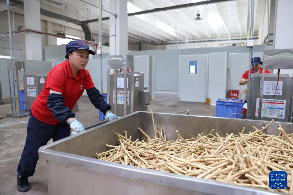 7月23日,工作人员在甘肃陇西县的一家药材公司的车间加工黄芪。 新华社记者 吕帅 摄