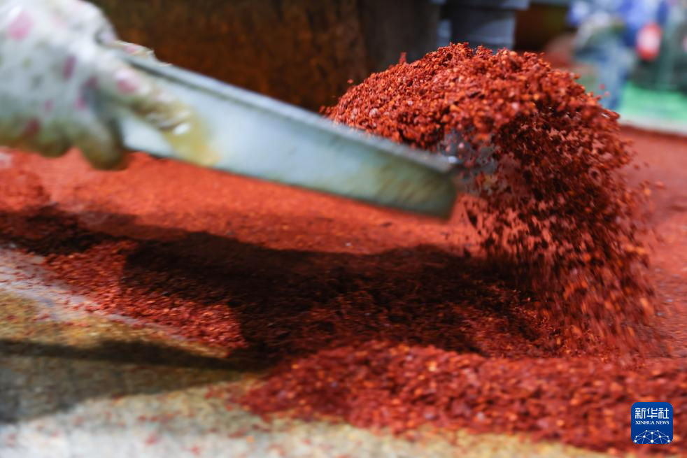 7月22日,工作人员在甘肃天水市甘谷县安远镇大城村的辣椒烘干和加工车间给辣椒粉过筛。 新华社记者 吕帅 摄