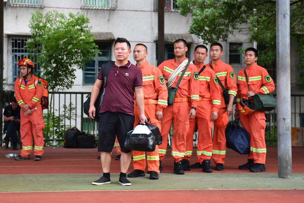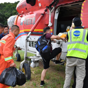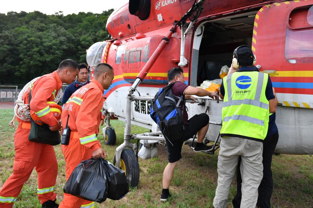 7月29日下午,湖南省资兴市八面山瑶族乡卫生院连坪分院医生李德明(前)准备搭乘救援直升机返回连坪村。 新华社记者 谭畅 摄