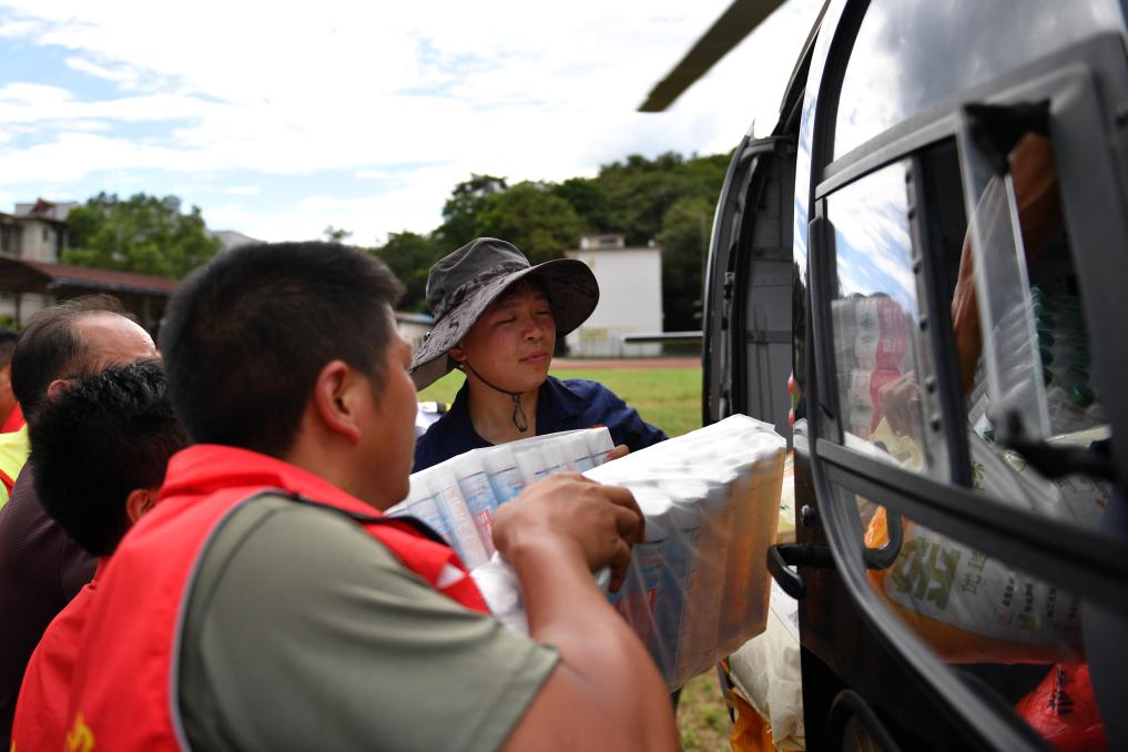 “快!直升机来了,准备搬运物资!”7月30日一大早,在湖南省资兴市第一中学,志愿者们听到指令后冲到操场。在螺旋桨轰鸣声中,他们迅速将摆放在草坪上的矿泉水、大米、食用油等物资搬运上直升机。