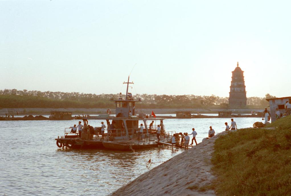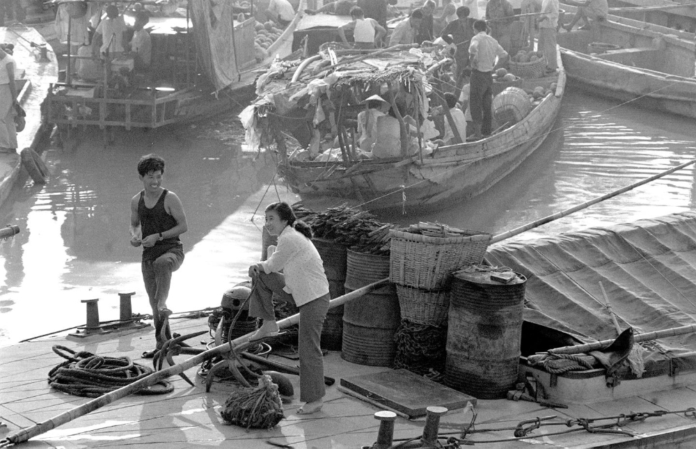 1985年,高邮水运专业户陈志德和李秀兰在大运河上跑船。