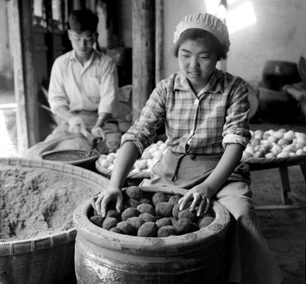 1962年,高邮食品加工厂蛋品车间工人在用稻草灰腌制鸭蛋。