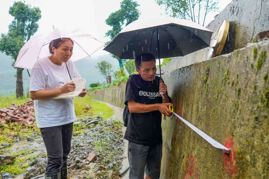 7月30日,富强村村党支部书记谢小红(左一)和地质灾害监测员鲁业江(右一)一起对富强村一处地质灾害点进行测量和监测。新华社记者 刘潺 摄