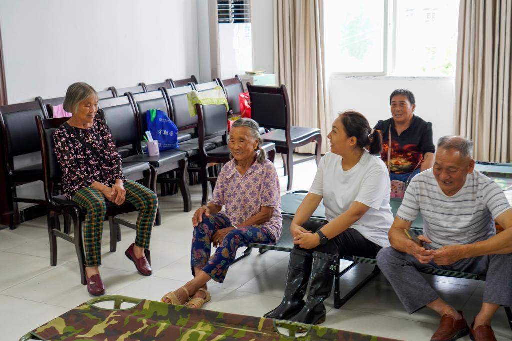 7月30日,富强村村委会办公点内,村党支部书记谢小红(右二)和被安置的群众聊天,了解他们的困难和需求。新华社记者 刘潺 摄