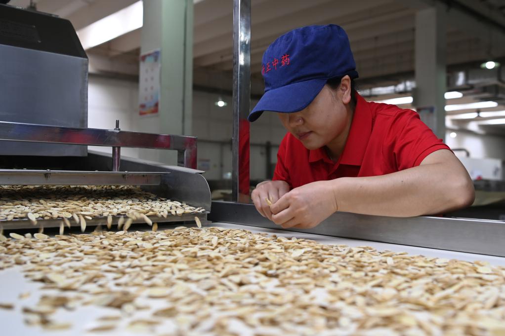 在陇西县一家药材企业,工人在中药材切片生产线上忙碌(7月23日摄)。新华社记者 范培珅 摄