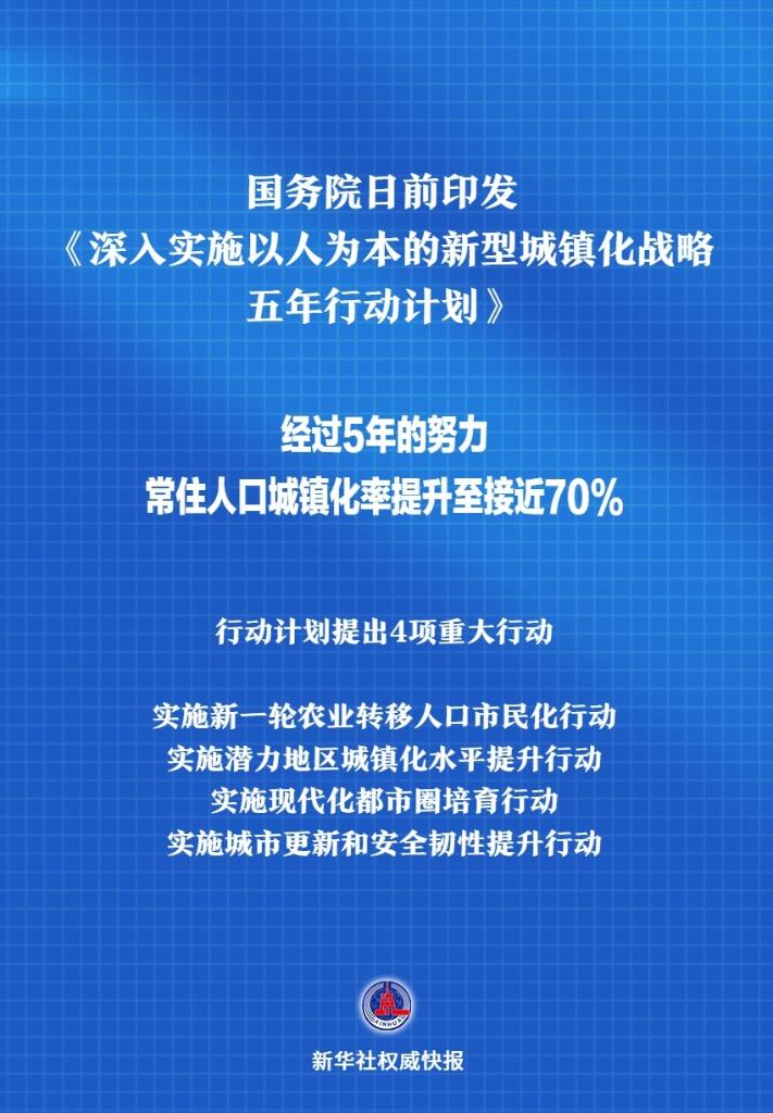 国务院日前印发《深入实施以人为本的新型城镇化战略五年行动计划》,提出4项重大行动:一是实施新一轮农业转移人口市民化行动,二是实施潜力地区城镇化水平提升行动,三是实施现代化都市圈培育行动,四是实施城市更新和安全韧性提升行动。