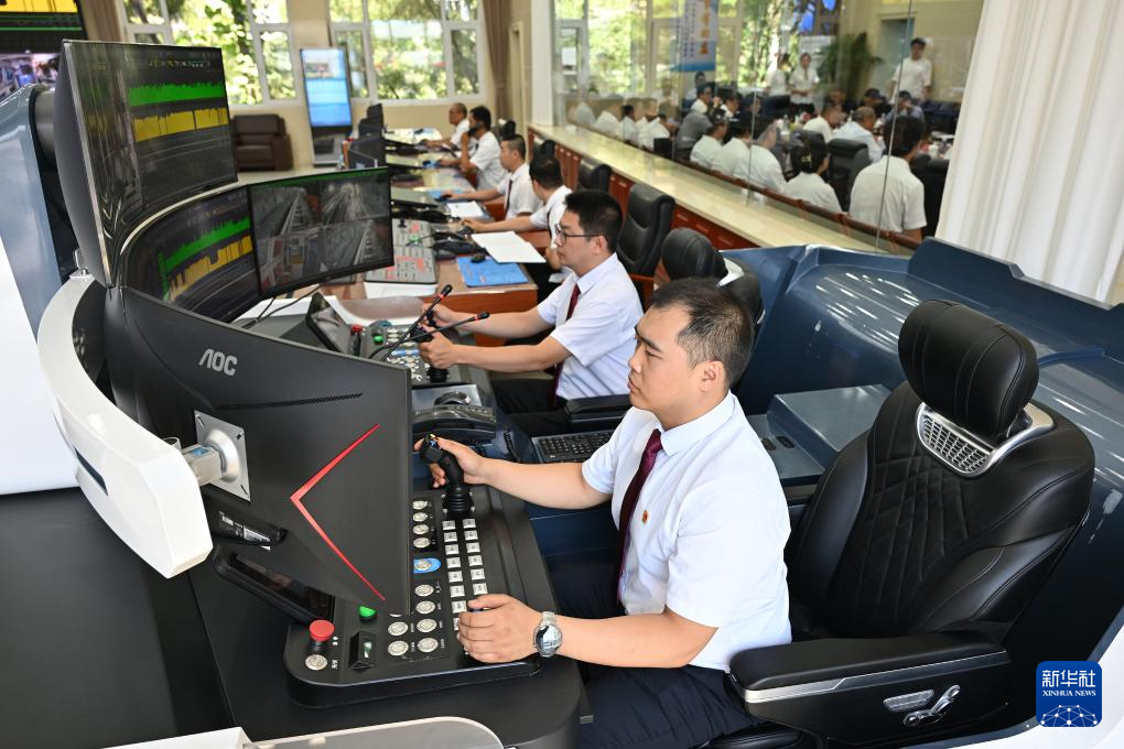 8月1日,工作人员在华阳二矿生产调度指挥中心内对井下设备进行远程操控。新华社记者 李鑫 摄