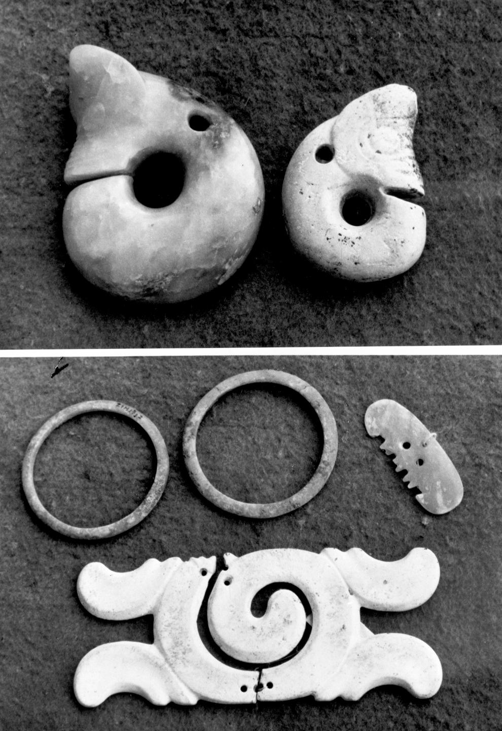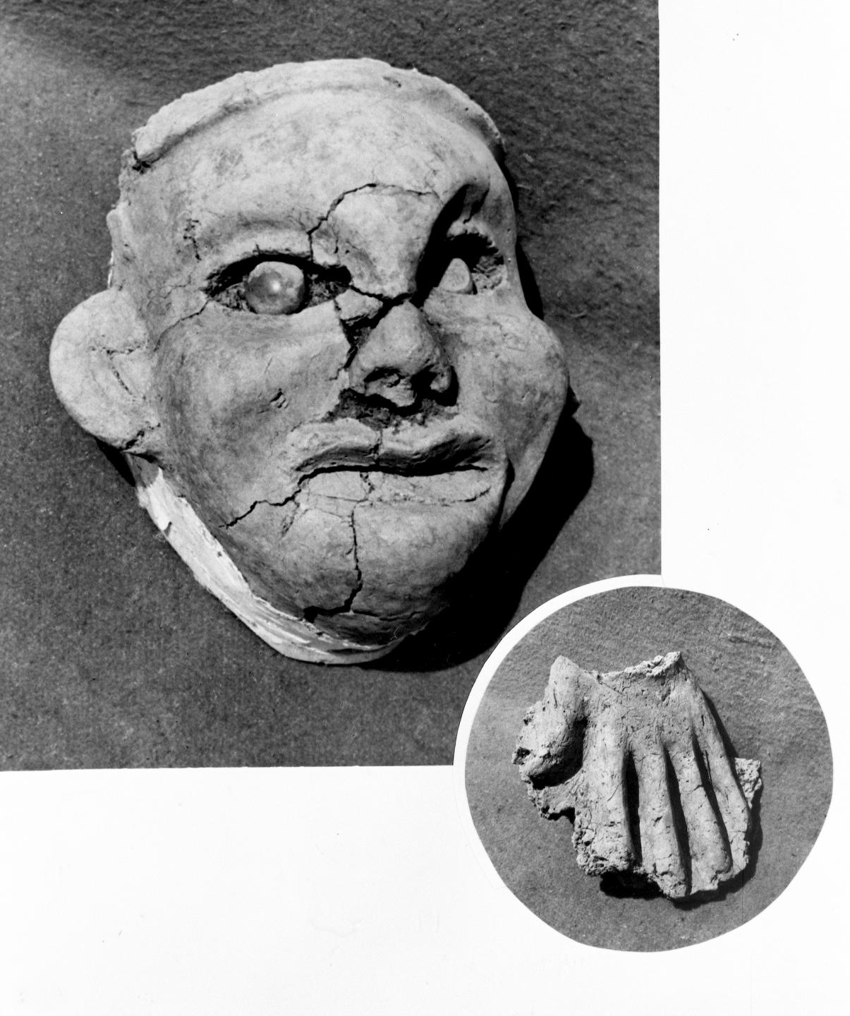 1983年10月,考古工作者在牛河梁遗址女神庙主室西侧群像残体中,首次发现一个较完整的接近真人大小的彩塑女神头像,其眼珠是用绿色磨圆玉片镶嵌而成,右下图为女神左手。