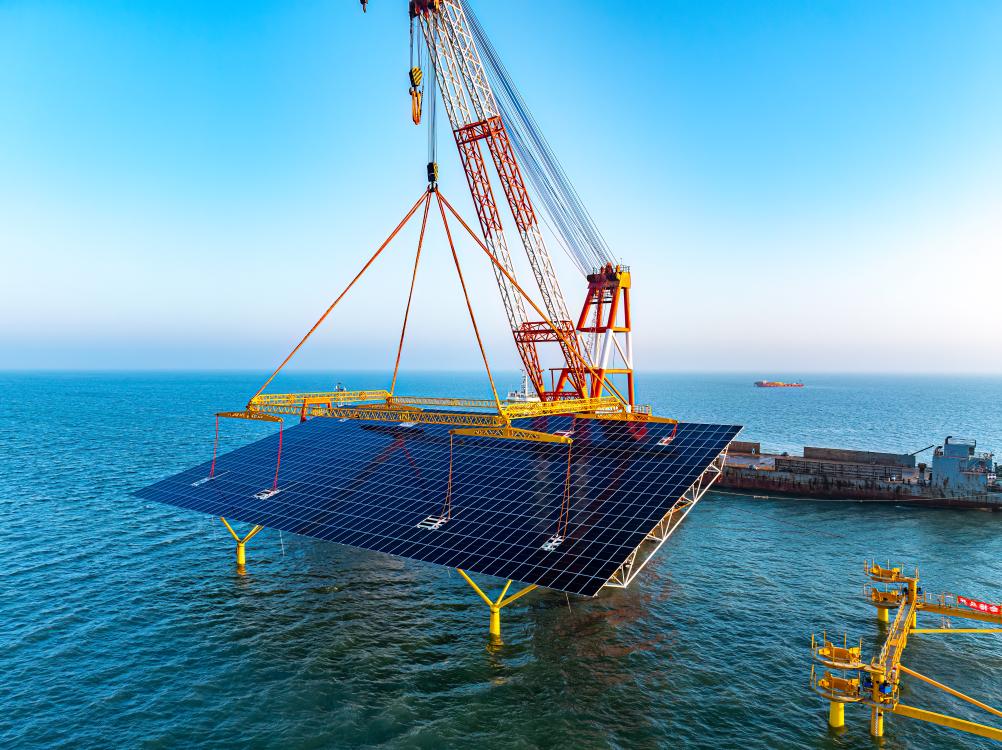 在东营市垦利区离岸8公里的一片海域,中国建筑第八工程局有限公司的技术工人正在进行国家能源集团国华投资HG14海上光伏项目的光伏平台吊装施工。国华投资山东分公司董事长吴昊说,作为山东“十四五”期间首批开发建设的海上光伏项目,该项目总投资约80亿元,投运后预计年发电量将达到17.8亿千瓦时,年可节约标准煤59万吨、减少二氧化碳排放144万吨,有力增加清洁能源供给。