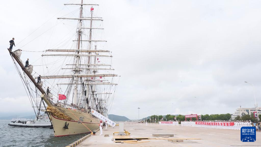 8月20日,中国海军首艘风帆训练舰“破浪”号在大连某军港准备起航(视频截图)。新华社发(陈佳楠摄)