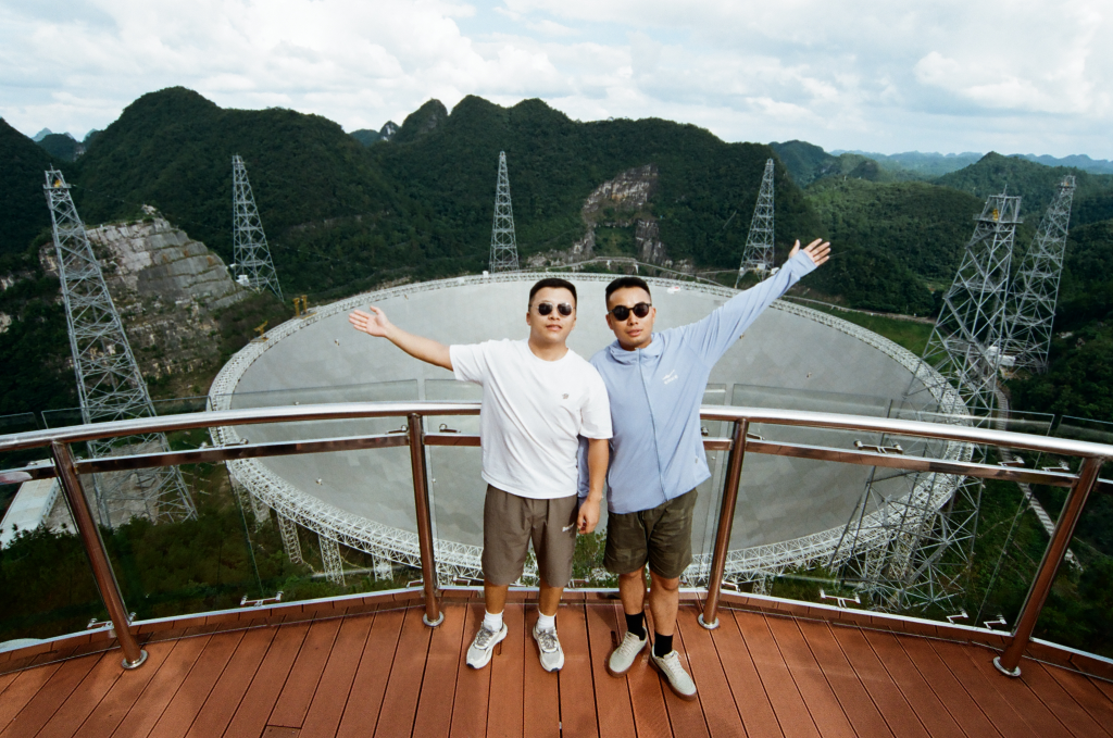 8月14日,游客在“中国天眼”景区观景台合影。新华社发