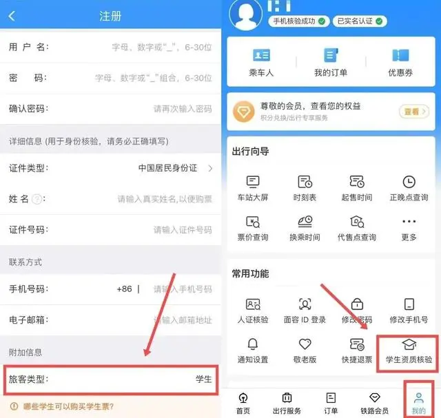 第二步:打开铁路12306App-我的-学生优惠资质核验专区填写相关优惠信息(姓名、证件号码、学校和家庭所在地、预计毕业年份)-提交,即可购买学生优惠票。