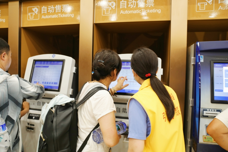 北京站售票窗口工作人员为旅客提供问询、购票等服务。图片来源:中国国家铁路集团有限公司提供