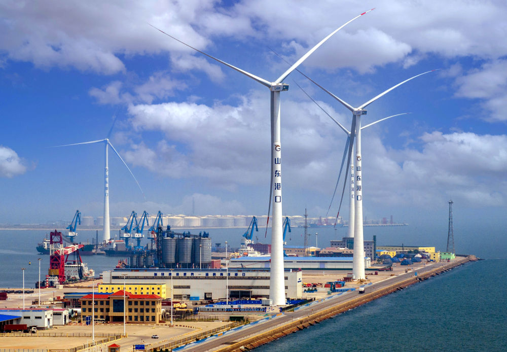 站在潍坊港的码头上,可以看到远处屹立的四台风机。“这几台风机年发电量约7000万千瓦时,目前整个潍坊港区的用电量是3500万千瓦时,不仅整个潍坊港区的碳排放量基本上为零,所产的电还能上电网,降低企业用电成本。”山东港口渤海湾港生产业务部部长张振琨说。