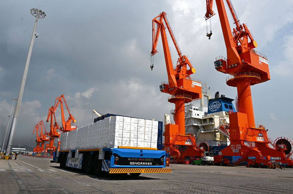 2024年8月6日,货车有序出入山东港口青岛港前湾集装箱码头。新华社记者 李紫恒 摄