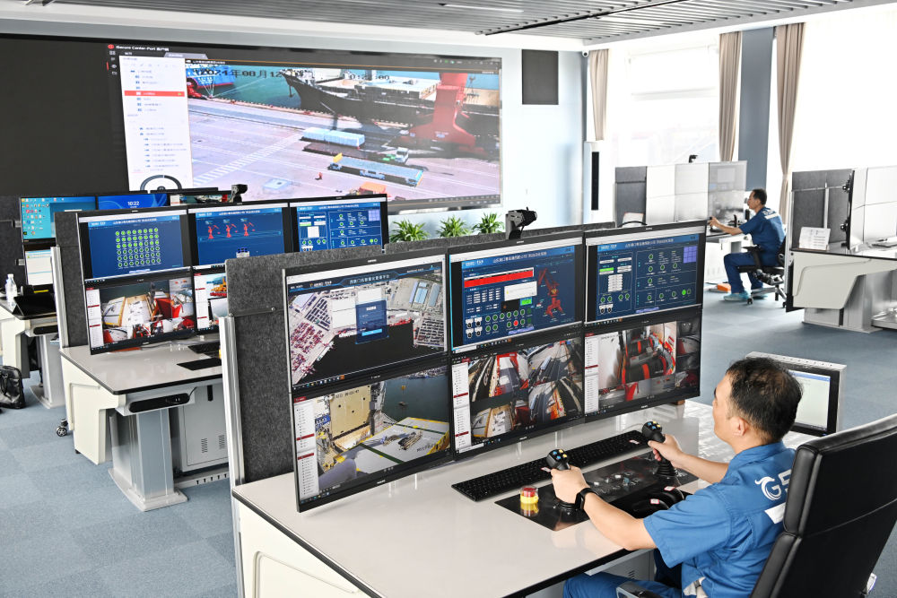 2024年8月12日,工作人员在山东港口青岛港西联公司纸浆码头控制室监控装卸作业。利用数字化技术,码头工人由“蓝领”变成“白领”,码头作业效率提高了20%,纸浆人工工作量降低了80%。新华社记者 李紫恒 摄