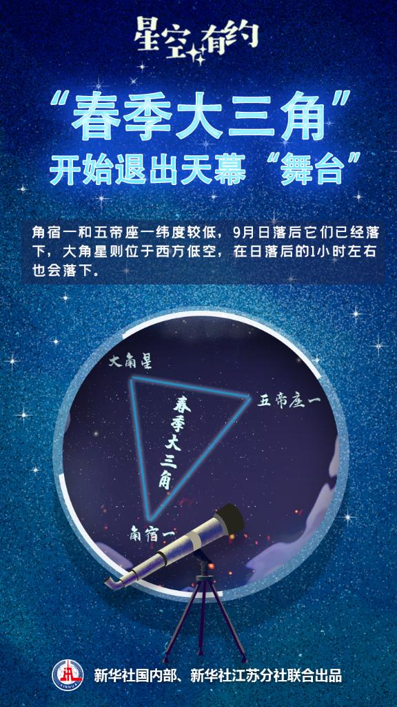 进入9月,由狮子座的五帝座一、室女座的角宿一以及牧夫座的大角星组成的“春季大三角”开始退出天幕“舞台”。“角宿一和五帝座一纬度较低,9月日落后它们已经落下,我们看不见它们。大角星则位于西方低空,在日落后的1小时左右也会落下。”中国科学院紫金山天文台科普主管王科超说。