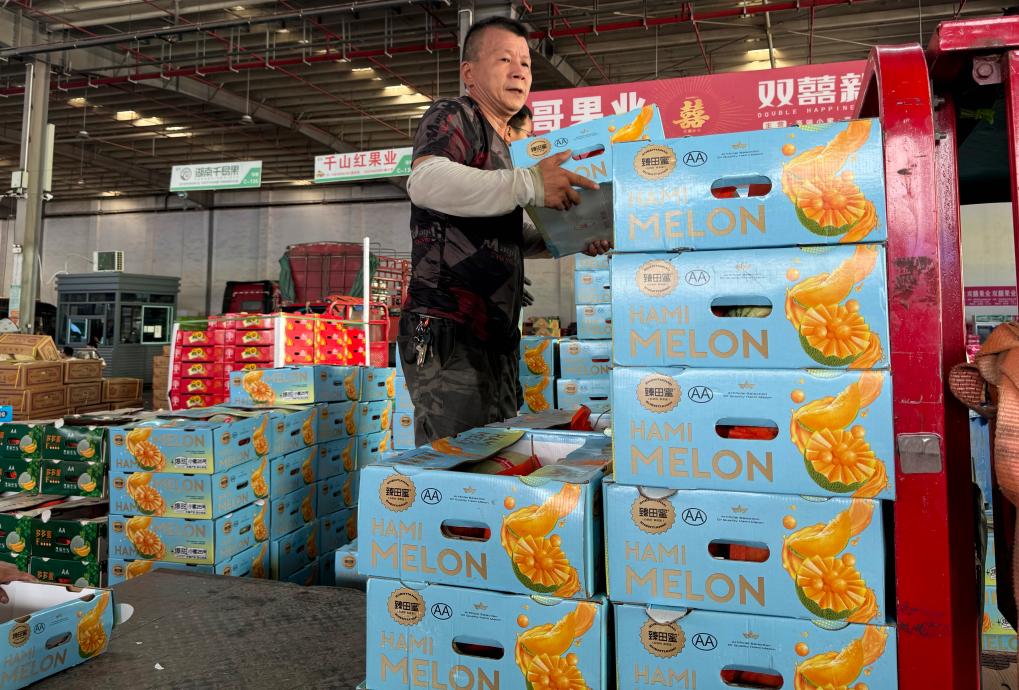 9月2日下午,商户在长沙市雨花区红星全球农批中心装运哈密瓜。(许海峰 摄)