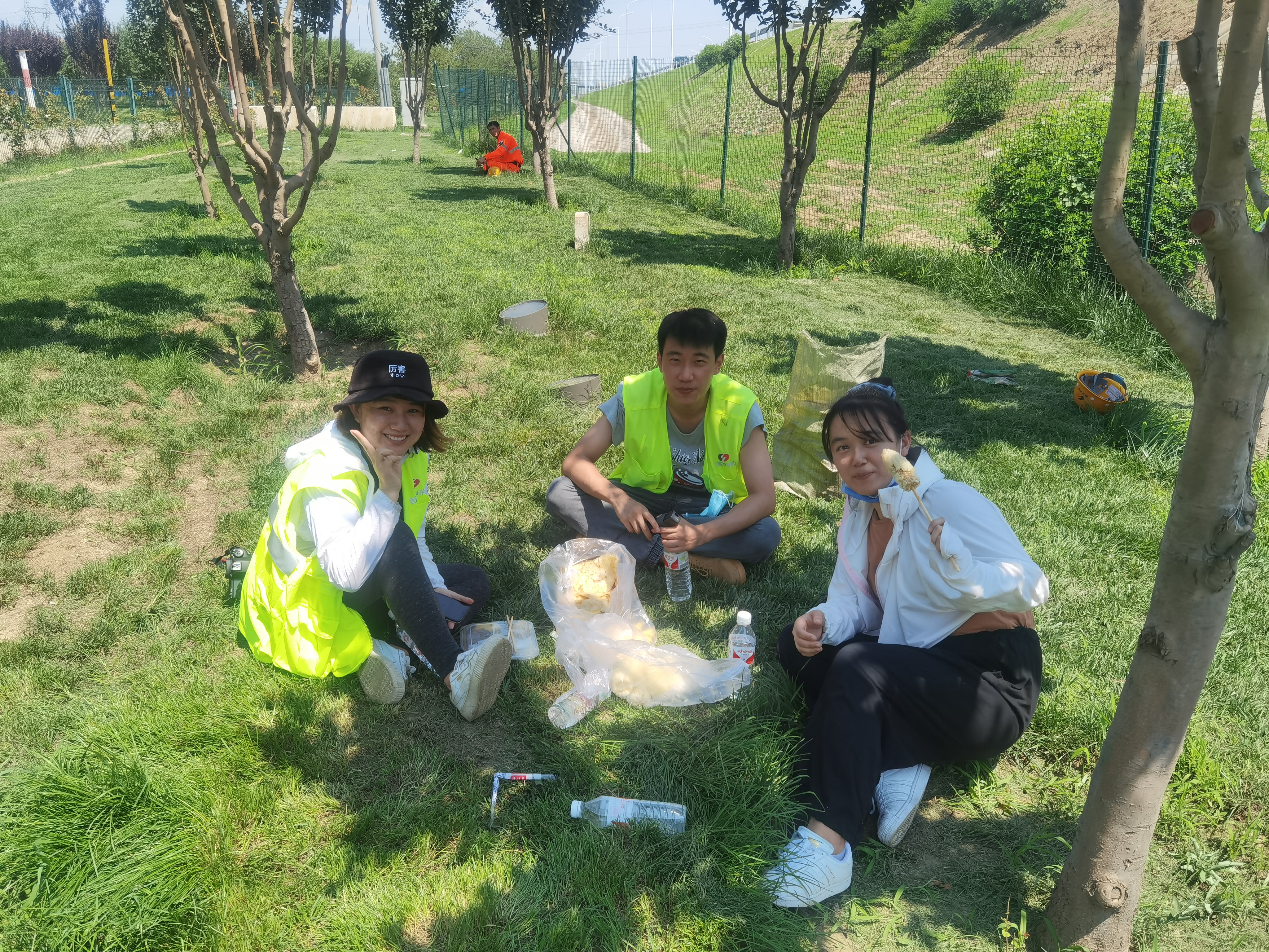 工人日报曹玥高温天采访道路养护工,中午在高速公路边坡一同休息用餐(左一)