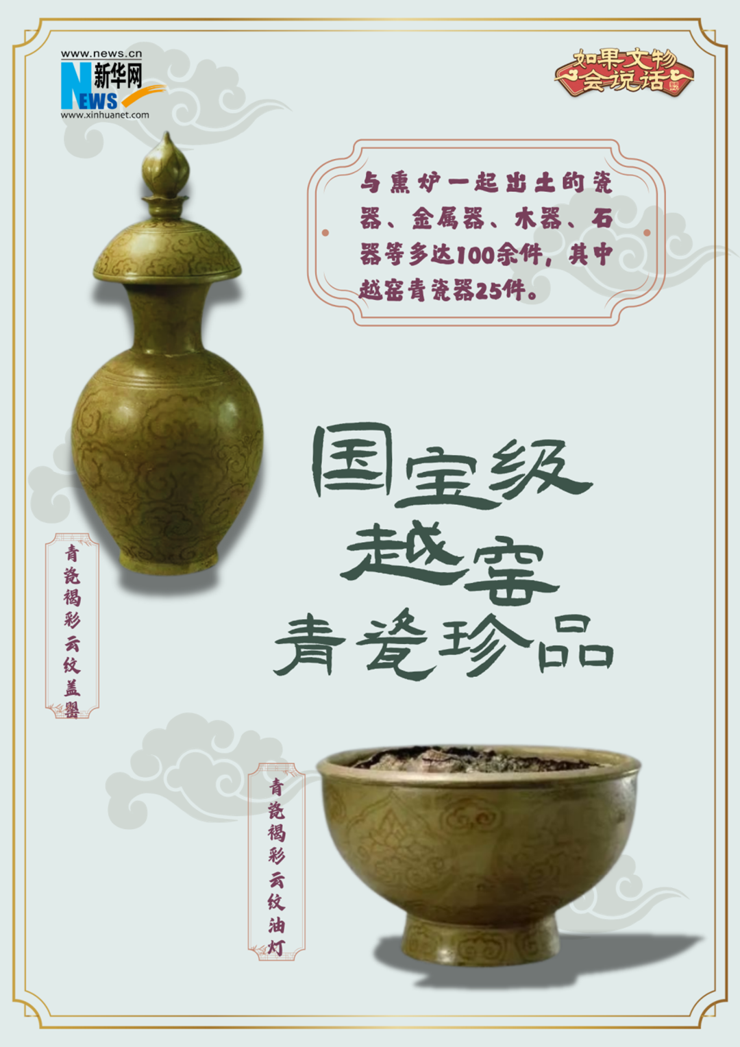 与熏炉一起出土的瓷器、金属器、木器、石器等多达100余件,其中还有青瓷褐彩云纹盖罂、青瓷褐彩云纹油灯两件国宝级越窑青瓷珍品。这些青瓷器以其“千峰翠色”著称,不仅展现了古代匠人的高超技艺,也进一步印证了史籍中关于吴越国生产精美瓷器的记载。