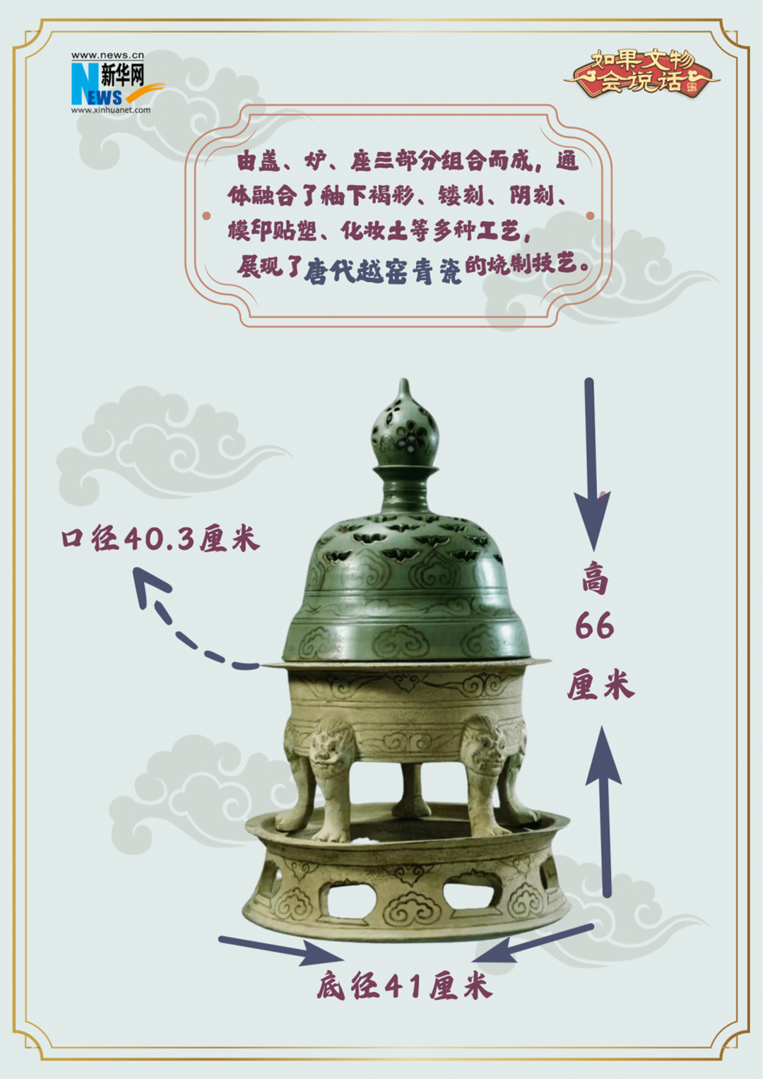 熏炉通高66厘米,口径40.3厘米,底径41厘米,由盖、炉、座三部分组合而成,通体融合了釉下褐彩、镂刻、阴刻、模印贴塑、化妆土等多种工艺,展现了唐代越窑青瓷的烧制技艺。