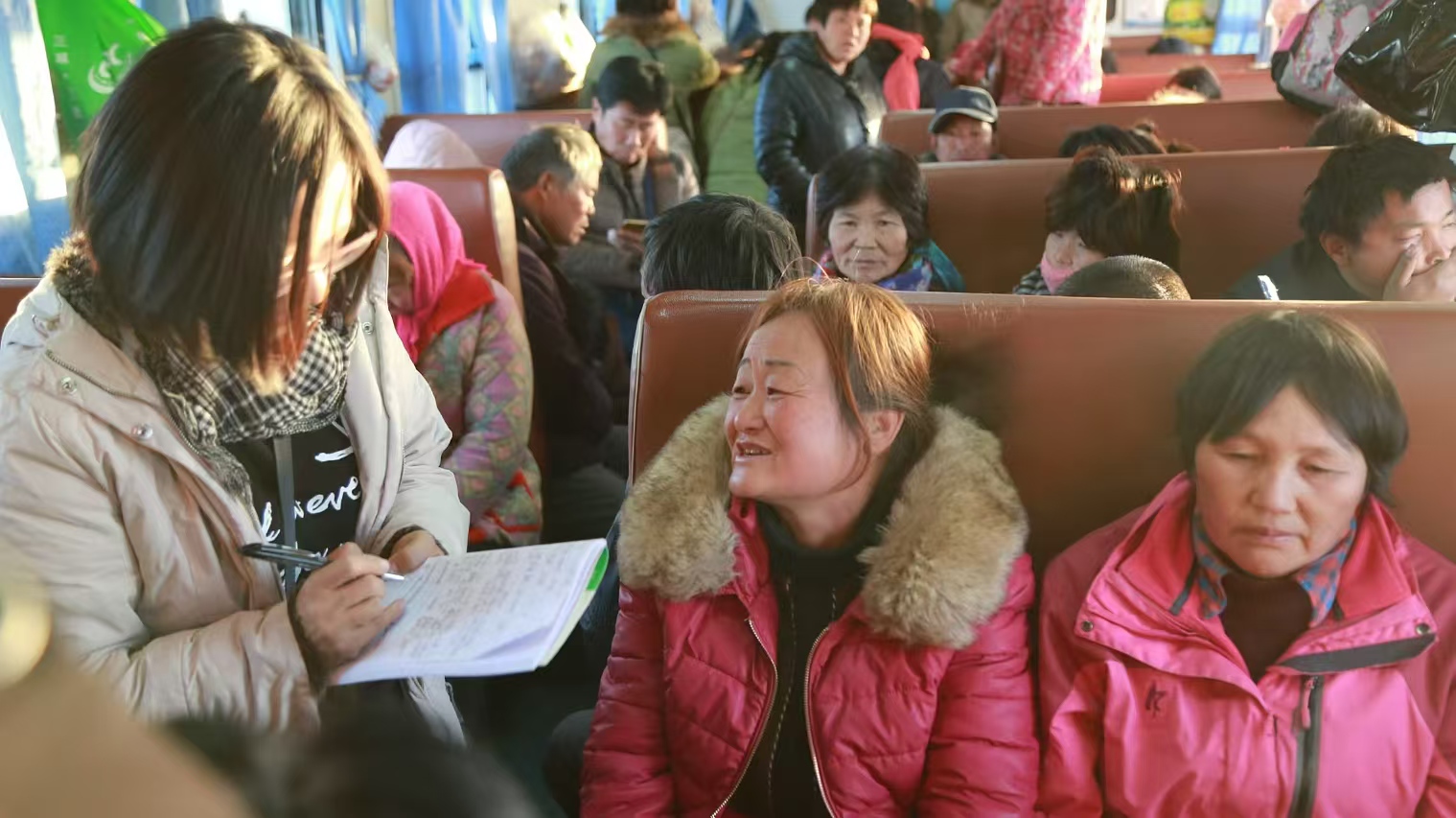 2018年12月,在从新疆阿克苏到河南郑州的K4130次棉农专列上采访采棉工。