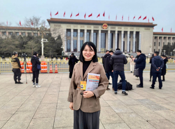 2024年采访全国两会时,李婕带着当日出版的《人民日报海外版》在人民大会堂前留影