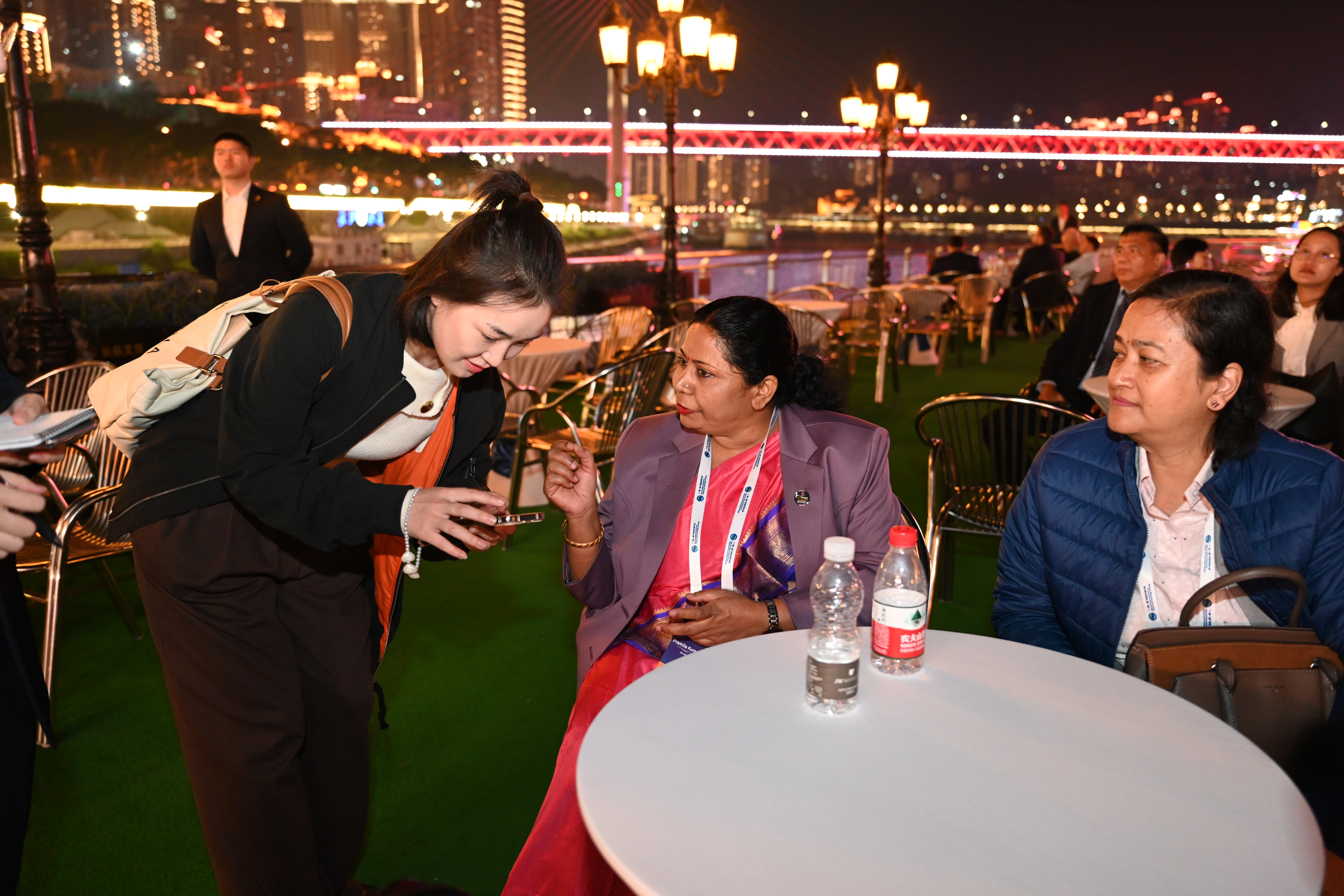 2023年11月5日晚,受邀参加首届“一带一路”科技交流大会的部分外宾乘船“两江游”。重庆日报记者何春阳正在采访外宾。