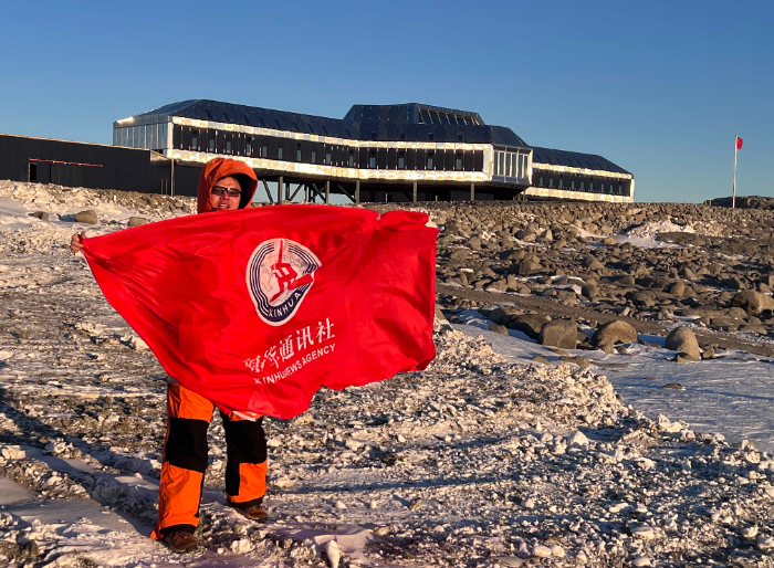 2024年2月,新华社记者周圆在南极秦岭站前展示社旗