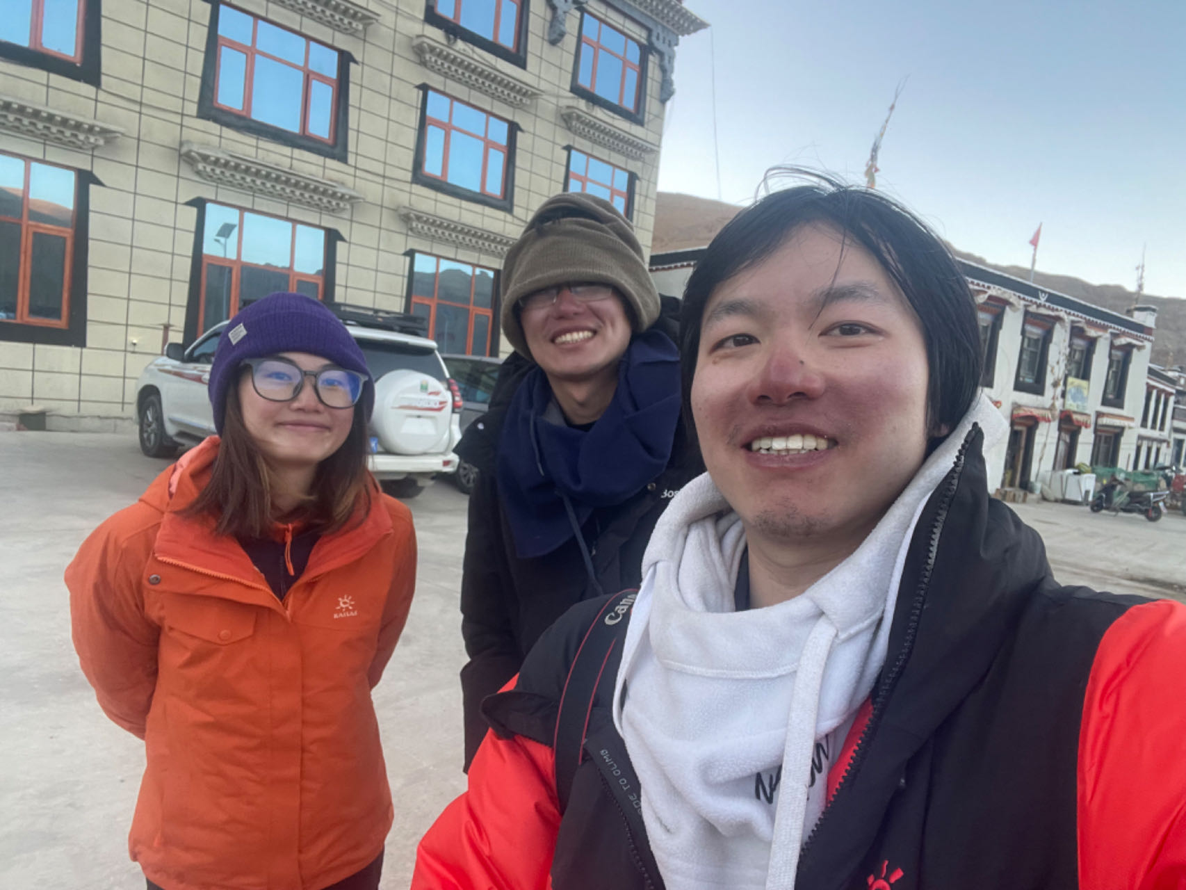 2023年5月7日,澎湃新闻记者邹桥(右一)、王选辉(中)、廖艳(左一)暂时结束跟队科考工作,从珠峰海拔6350米营地下撤回到珠峰脚下的扎西宗乡巴松村。