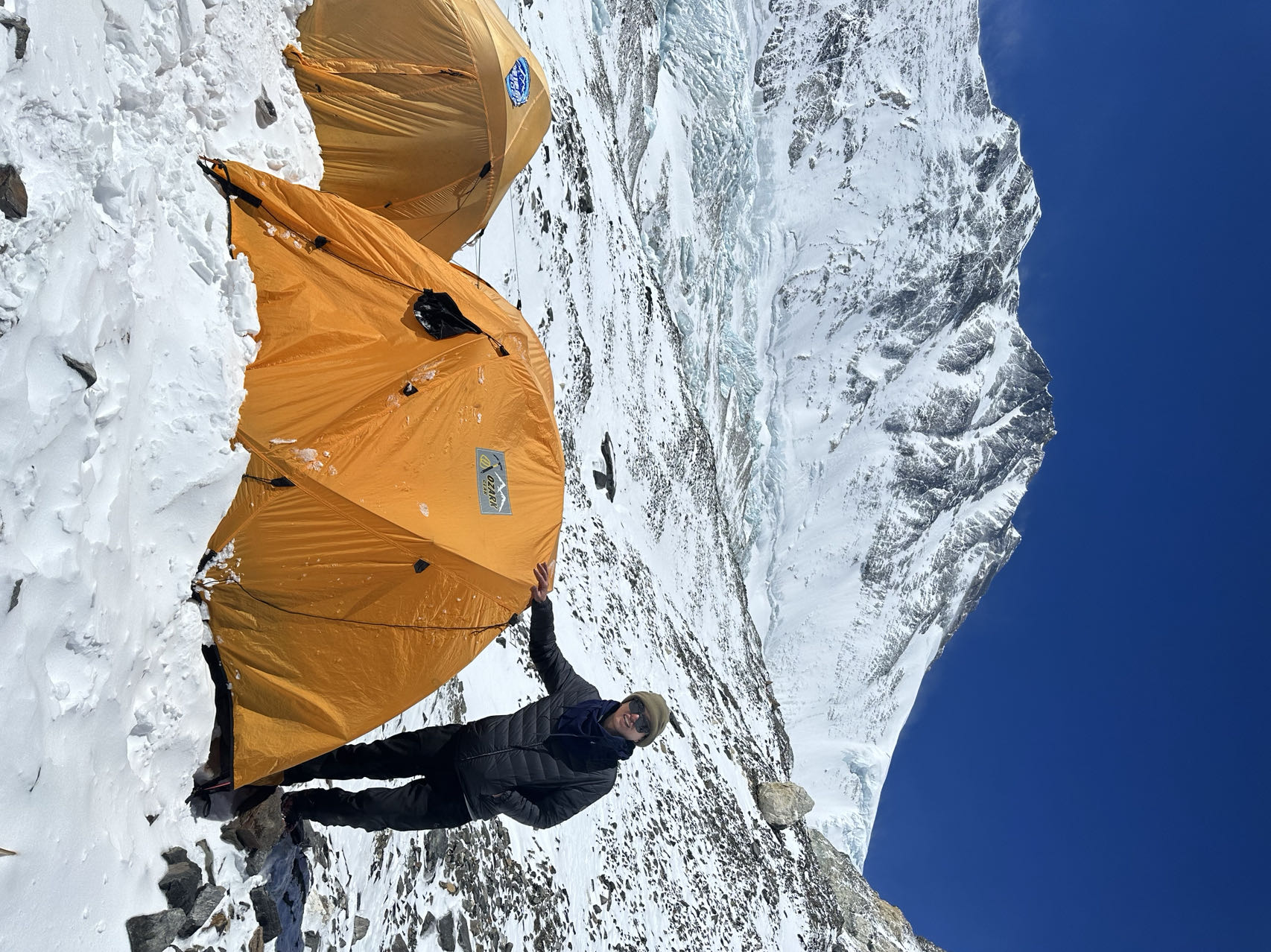 2023年5月4日,王选辉在珠峰海拔6350营地的科考帐篷旁。