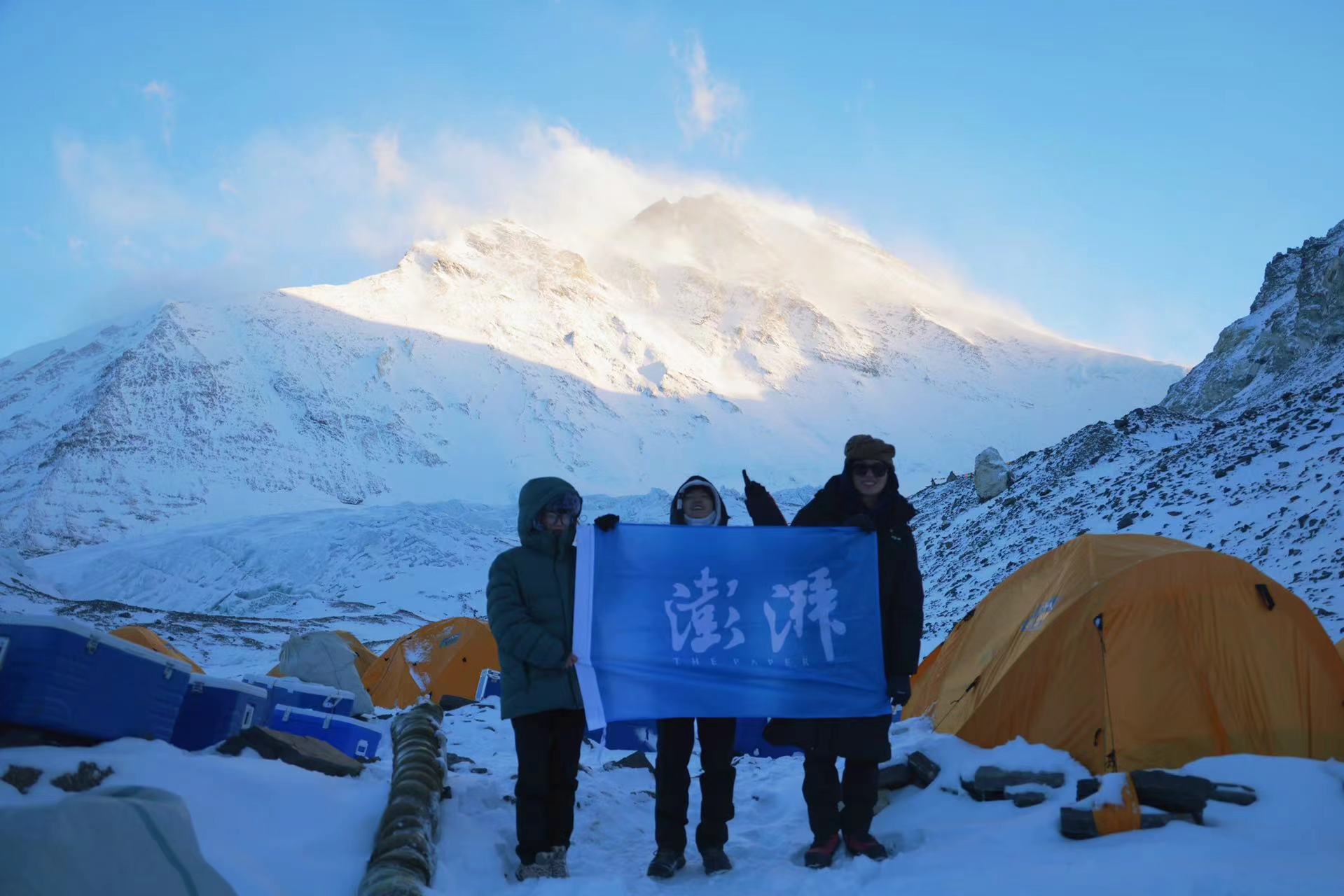 2023年5月6日,澎湃新闻记者王选辉(右一)、邹桥(中)、廖艳(左一)跟随中科院科考队来到珠峰海拔6350米营地。