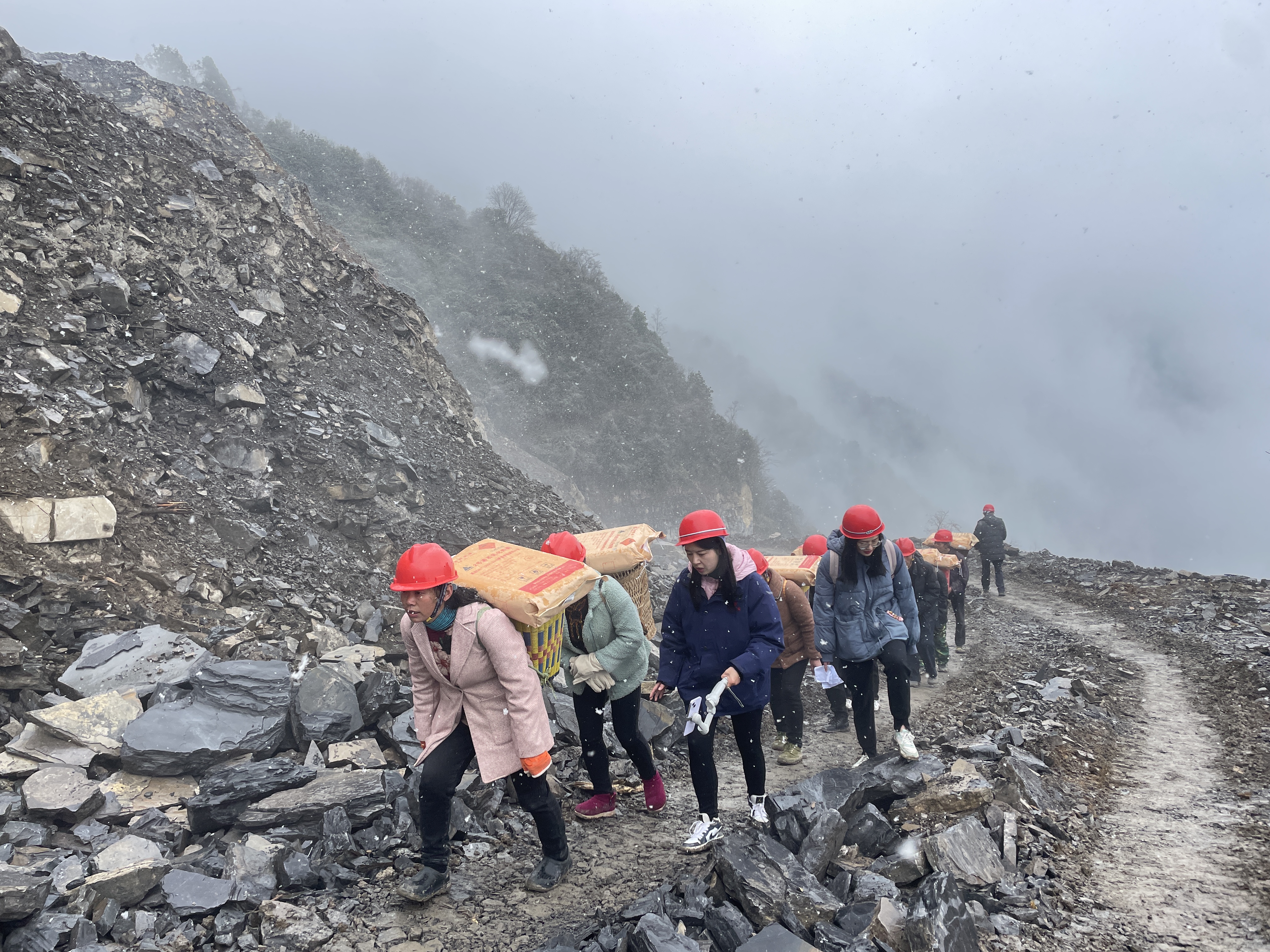 恩施日报社周淑芬2023年12月1日采访见天村干部群众向海拔1900米的鸡公岭上运送修路物资的震撼画面