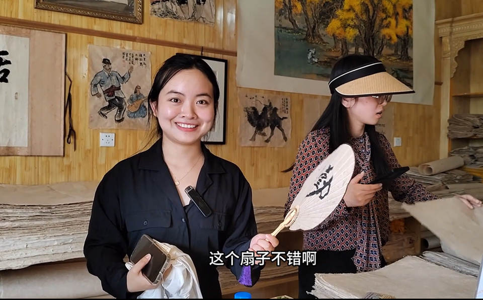在新疆传统古村落墨玉县布达村一家非遗桑皮纸店铺内采访