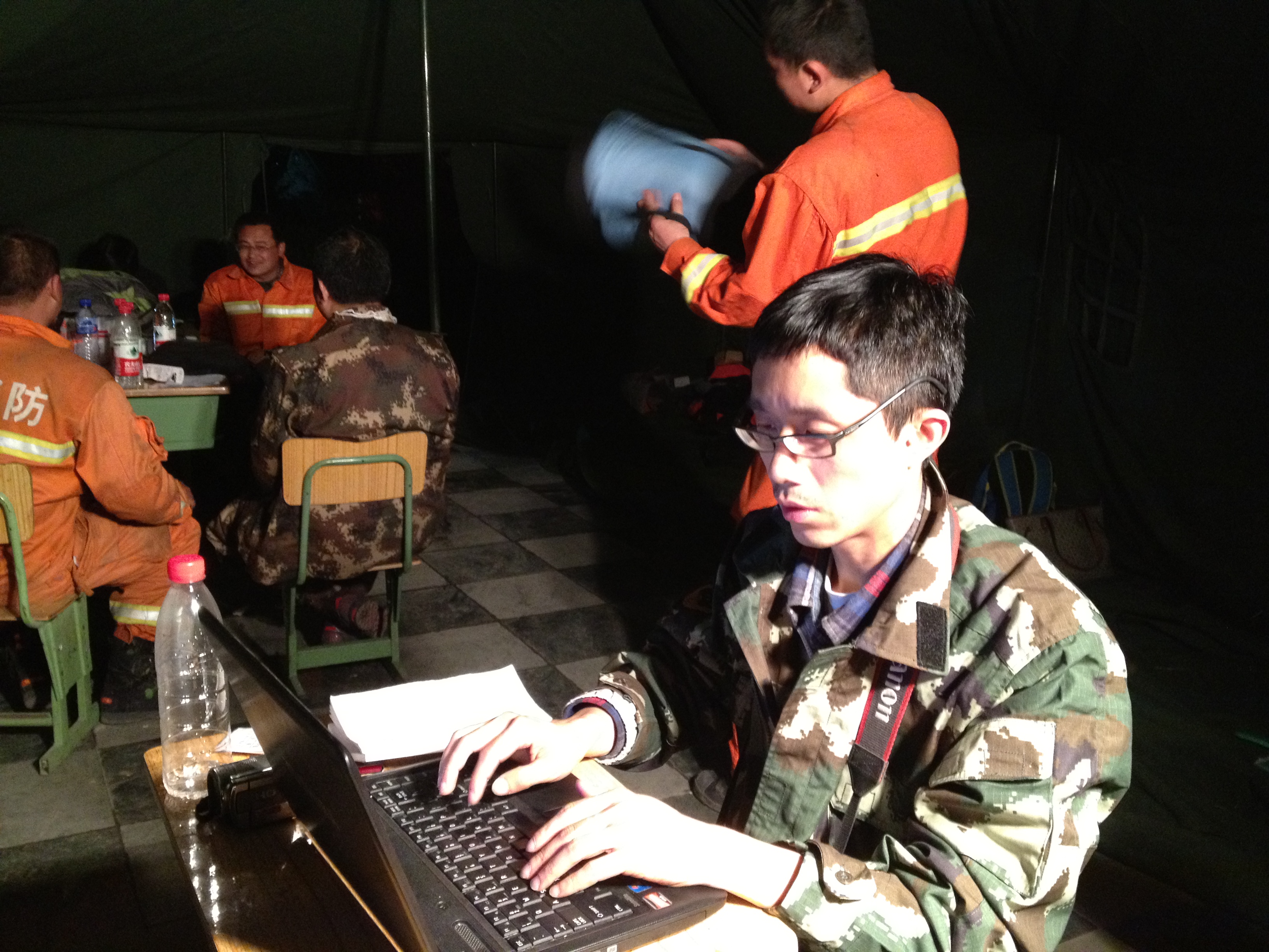 2013年4月,王鑫昕在四川芦山地震救灾现场写稿
