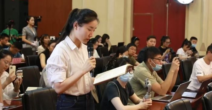 解放军新闻传播中心楚亚楠在神舟十七号航天员记者见面会现场采访拍摄