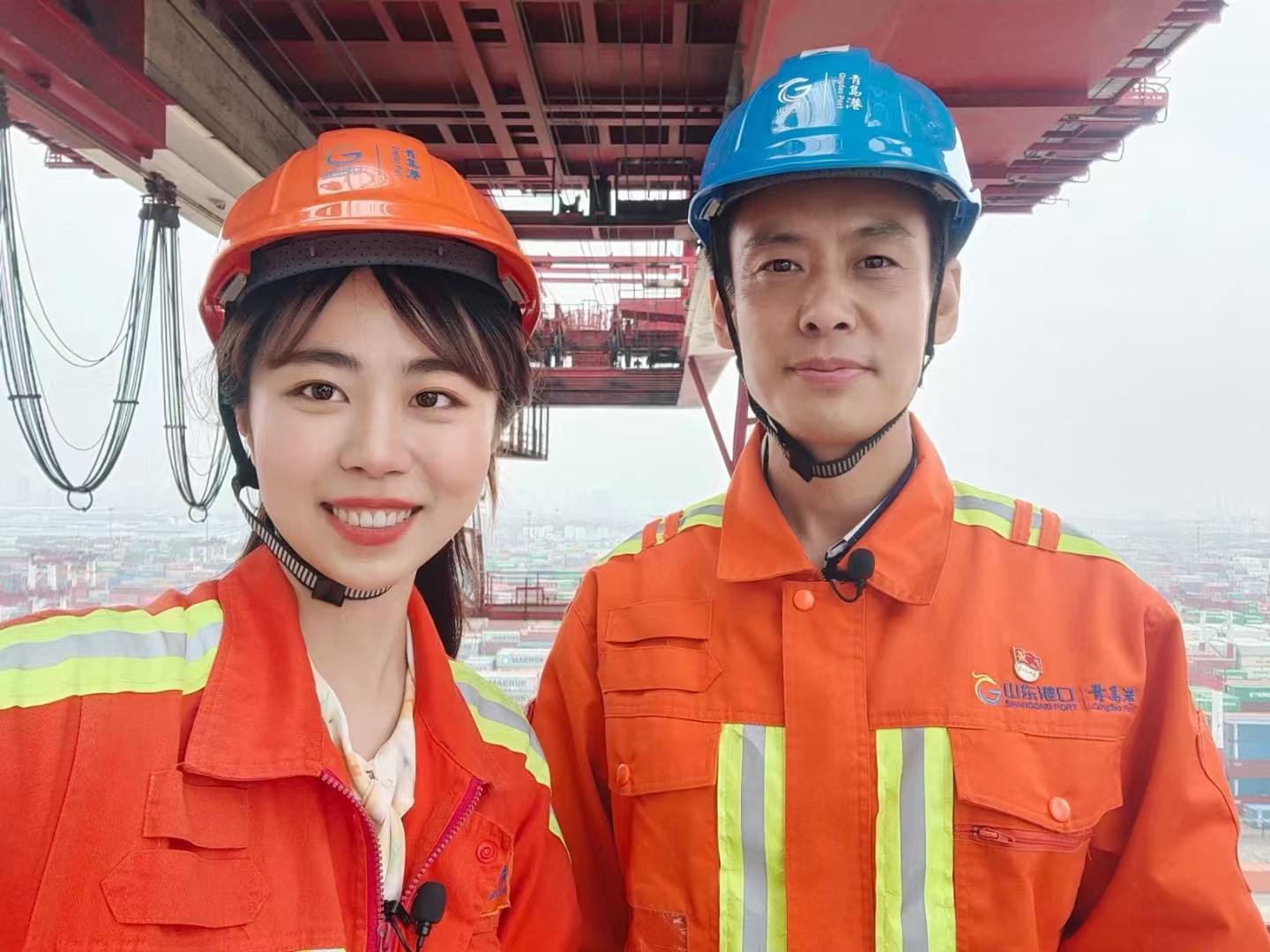 在山东港口青岛港采访时与大国工匠郭磊合照