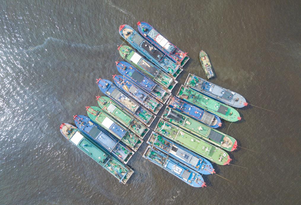 9月4日,船只在海南省海口市新港码头停靠避风(无人机照片)。新华社记者 蒲晓旭 摄
