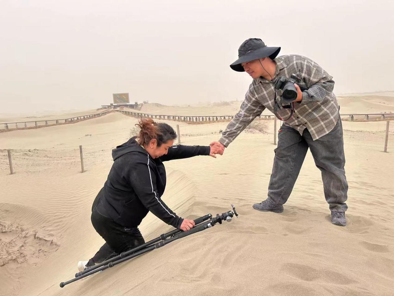 2024年4月28日,在兵团第二师31团兵团广播电视台记者苏丽燕·阿依拜克和同事在采访《幸福甜蜜石榴籽 宋财富:用青春染绿沙漠》选题时,在沙漠中手持拍摄设备艰难的走过沙丘进行采访。