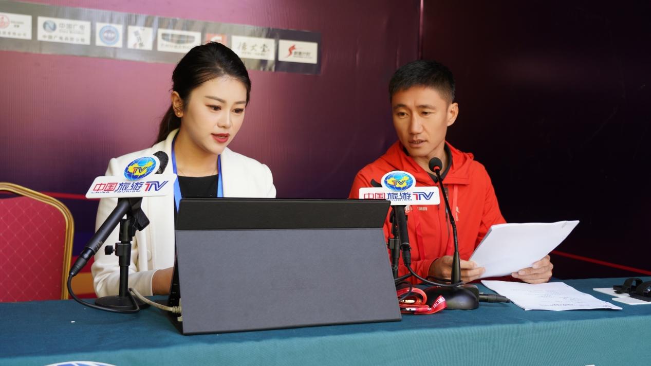 图为2023年10月15日第二师铁门关市半程马拉松赛活动中,主持人(辛俊怡)和嘉宾直播解说赛事时的场景