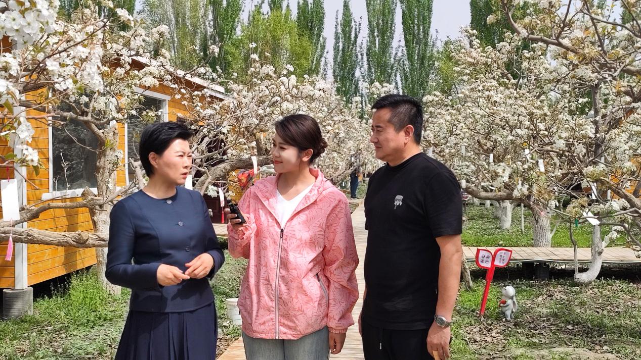 图为2024年铁门关市双丰梨花文化活动,记者(辛俊怡)采访嘉宾闫光明、赵海燕夫妇的场景