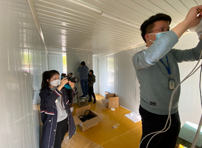 光明日报社姜奕名采访拍摄红外测温仪生产及安装。
