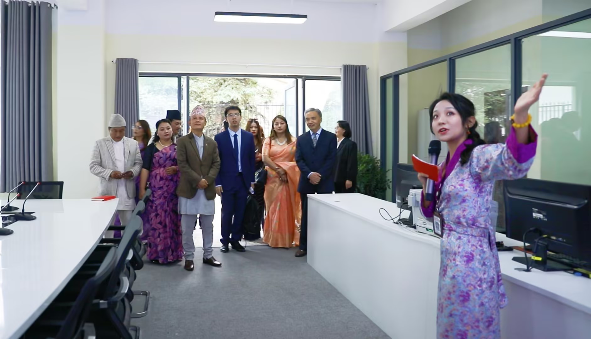 西藏广播电视台 普珍 图为2024年5月24日,本人在采访尼泊尔赴藏交流团体后以英语为他们介绍本台情况