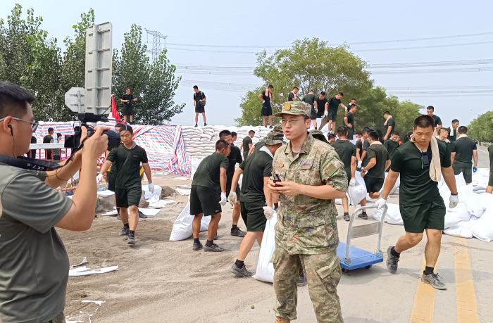 解放军新闻传播中心李秉宣2023年8月在天津静海出镜报道部队官兵执行抗洪抢险救灾任务