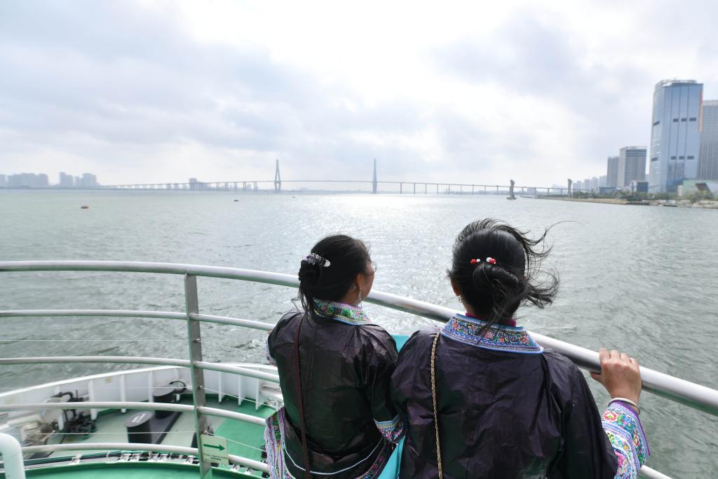 在广东省湛江市近海海域的游船上,乌英苗寨的妇女梁足英(左)和吴妹富在欣赏海景(2021年11月4日摄)。在粤桂协作资金的支持下,她们第一次走出大苗山参观学习。