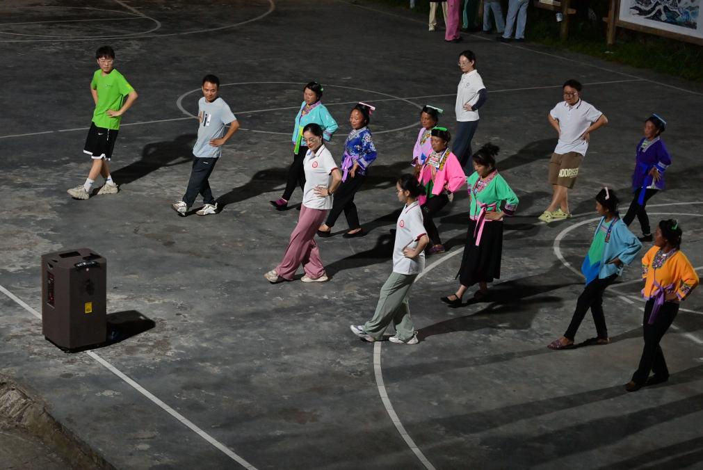 在乌英苗寨,广西“桂姐姐”讲解员叶子雯(左)在指导妇女们练习跳舞(8月8日摄)。