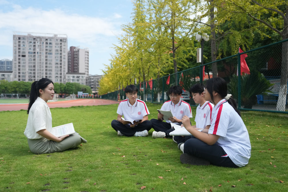 ↑龚佳颖(左)与学生在校园里交流。
