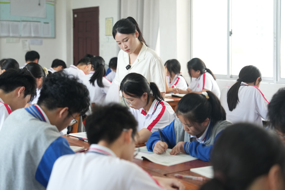 ↑龚佳颖(中)在课堂上检查学生作业。