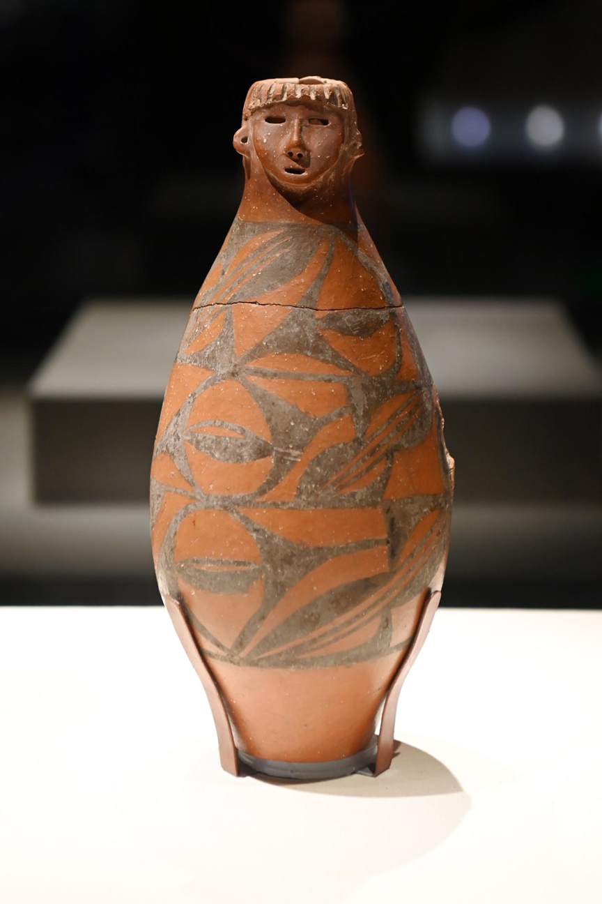 大地湾出土的人头形器口彩陶瓶。新华社记者 范培珅 摄